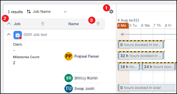 - The child row displays the Resource's Job details, and other details you choose to view.