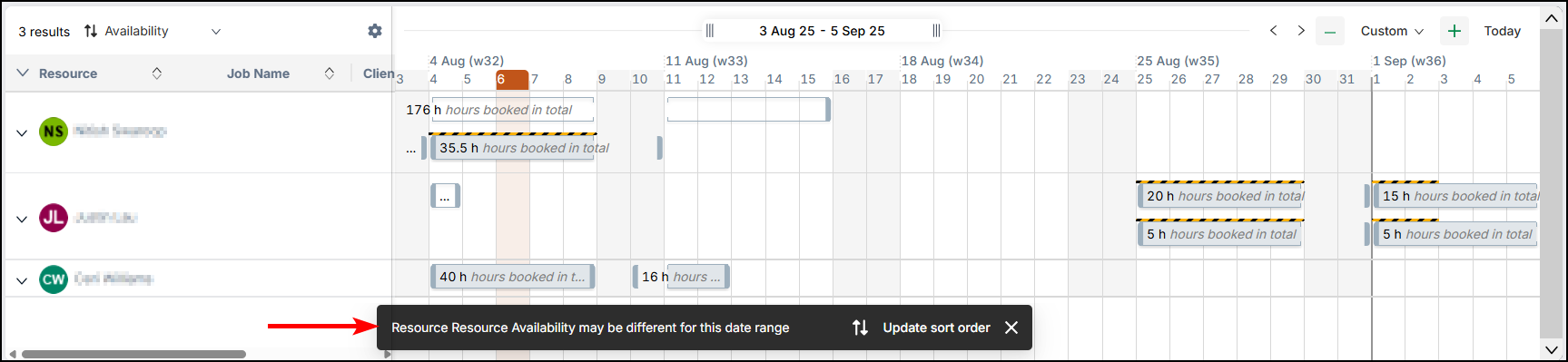 Retain calculates a Resource's availability based on the current visible date range. Retain does not automatically update the sort order of the grid if you take an action that affects the date range. This includes actions to change the view date, scroll the grid to another date, resize the date range, or add, update, or delete a booking in a way that affects the Resource's availability.