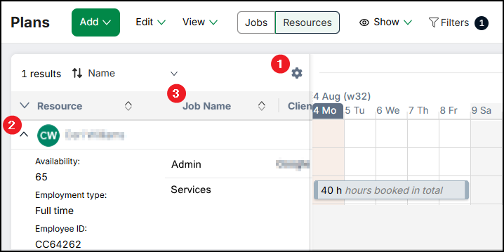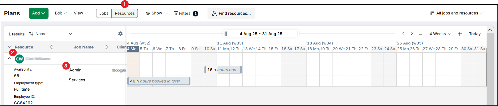 In Resources View, the grid displays Resources as the parent row and Jobs as the child row in your plan.