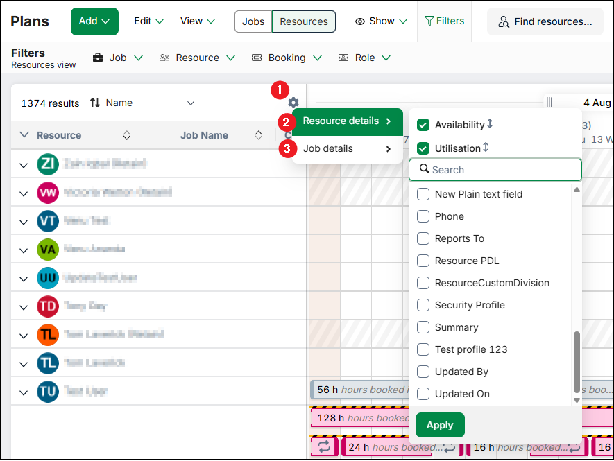 - From Resource Details, check the boxes for each field you want to display, then click Apply.