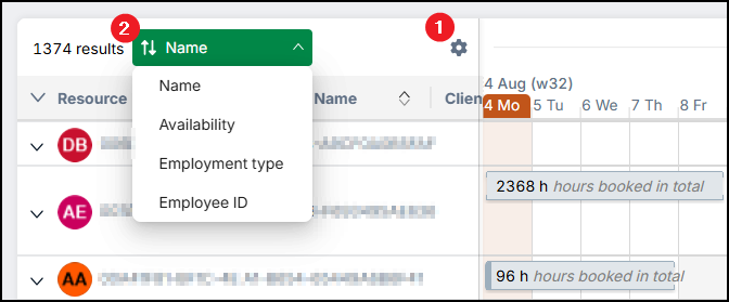 Retain sorts the grid. If you select Availability, Utilisation, or Available Hours, Retain may take longer to load. - To reverse the sort order, select the field again.